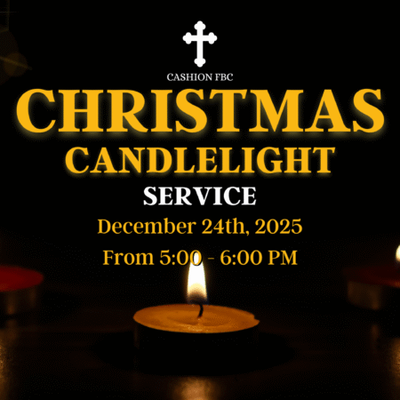 Christmas Candlelight Service December 24, 2025 5:00 pm – 6:00 pm FBC Cashion 18827 State Hwy 74F, Cashion, OK 73016 Get Directions